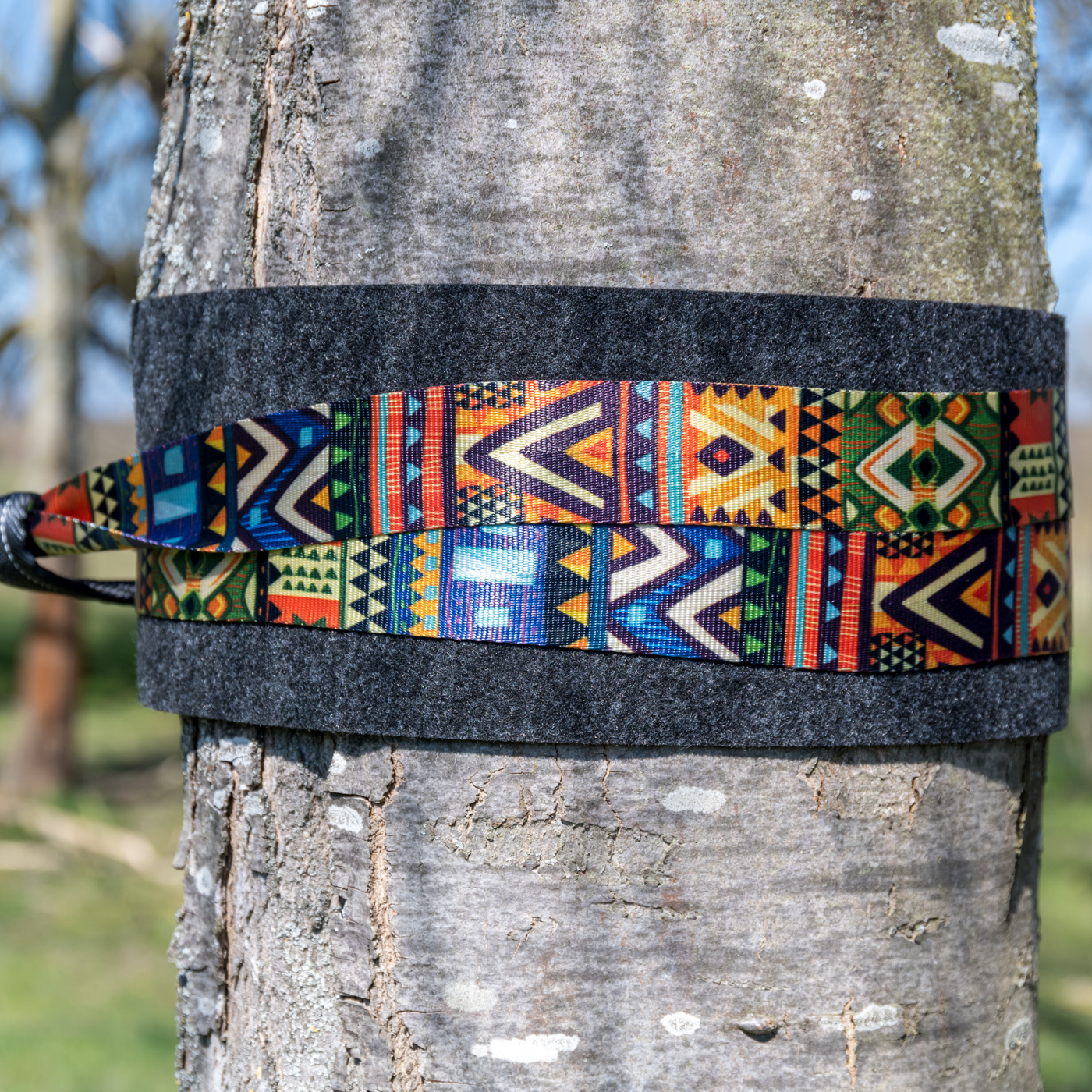 – Zweiteiliges Slackline Set (in einizgartigem Design) mit schwarzer Komfortratsche und 2 Stück robusten Baumschonern 120 x 15 cm